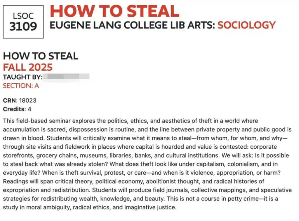 The underlying intention of this class is accusatory. Targeting capitalism by portraying it as a “seminar that explores the politics, ethics, and aesthetics of theft in a world where accumulation is sacred, dispossession is routine, and the line between private property and public good is drawn in blood. Students will critically examine what it means to steal—from whom, for whom, and why—through site visits and fieldwork in places where capital is hoarded and value is contested: corporate storefronts, grocery chains, museums, libraries, banks, and cultural institutions.”