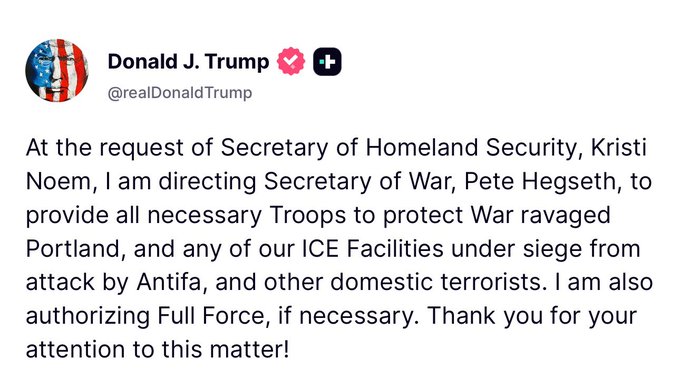 The American people deserve clarity. The President has the sole authority to determine when insurrection or unlawful obstruction exists. Portland’s 100-night siege against federal officers and property fits squarely within that definition. Secretary Noem asked for help. Secretary Hegseth prepared the forces. President Trump gave the order. The chain of command worked as designed. That is not tyranny. It is constitutional government in action.