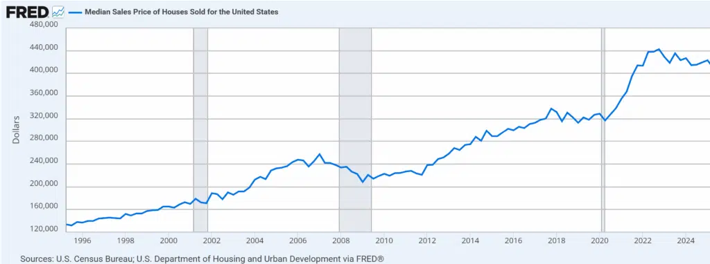 Much of the Boomer’s wealth has been tied to the rapid appreciation of American home prices over the last thirty years. According to data from the Federal Reserve Bank of St. Louis, the median home prices in the United States has skyrocketed from $134k in Q2 1995 all the way to over $410k in July 2025.