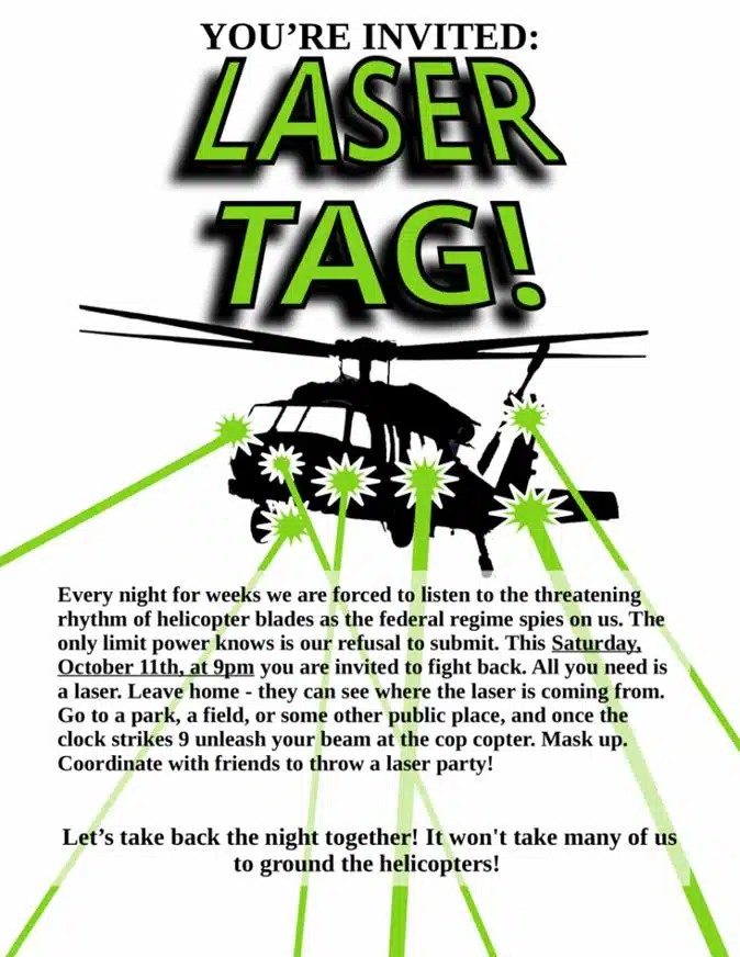 “Every night for weeks, we are forced to listen to the threatening rhythm of helicopter blades as the federal regime spies on us. The only limit power knows is our refusal to submit. This Saturday, October 11th, you are invited to fight back. All you need is a laser.”