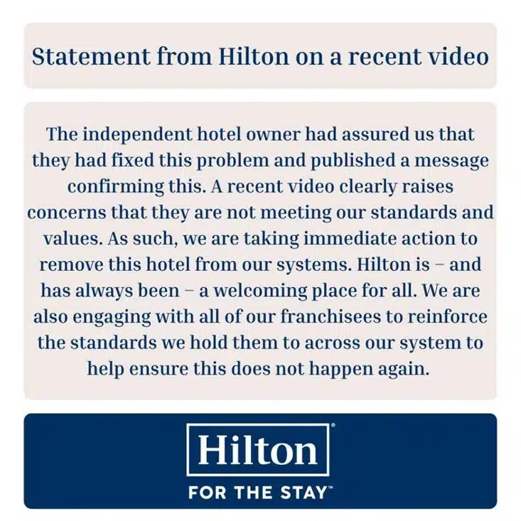 “Hilton is – and has always been – a welcoming place for all. We are also engaging with all of our franchisees to reinforce the standards we hold them to across our system to help ensure this does not happen again.”