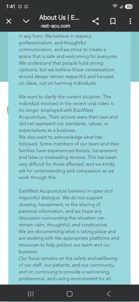“We want to clarify the current situation. The individual involved with the recent viral video is no longer employed with EastWest Acupuncture.”
