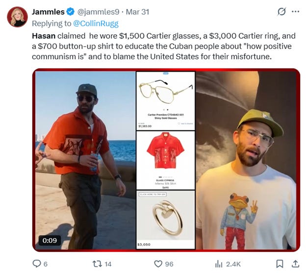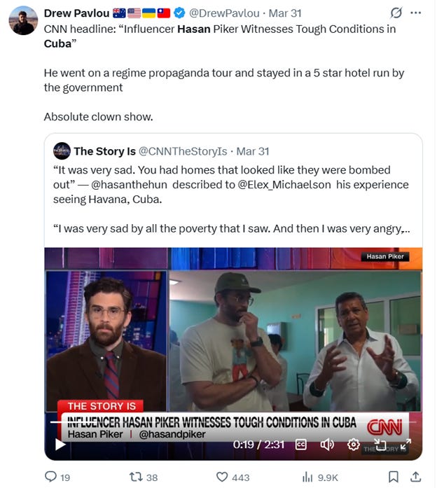 In fact, not very long ago, noted left-wing streamer (and open America hater) Hasan Piker along with a number of other left-wing quasi-celebrities decided to show their support for Cuba by going on a cruise there. It was just as ridiculous as you’d expect,
