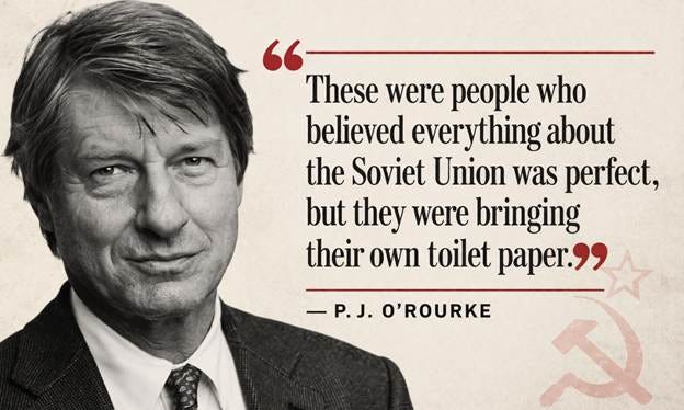 This kind of thing is actually nothing new. In fact, way back in 1982, P.J. O’Rourke went on a similar junket to the Soviet Union with a bunch of aging hippies so he could write an article about it. The best line from it was,