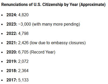 Yet, what do we see in America? Almost nobody leaves our country. We have 341 million people who live here, yet here are the number of people that renounced their citizenship over the last few years.